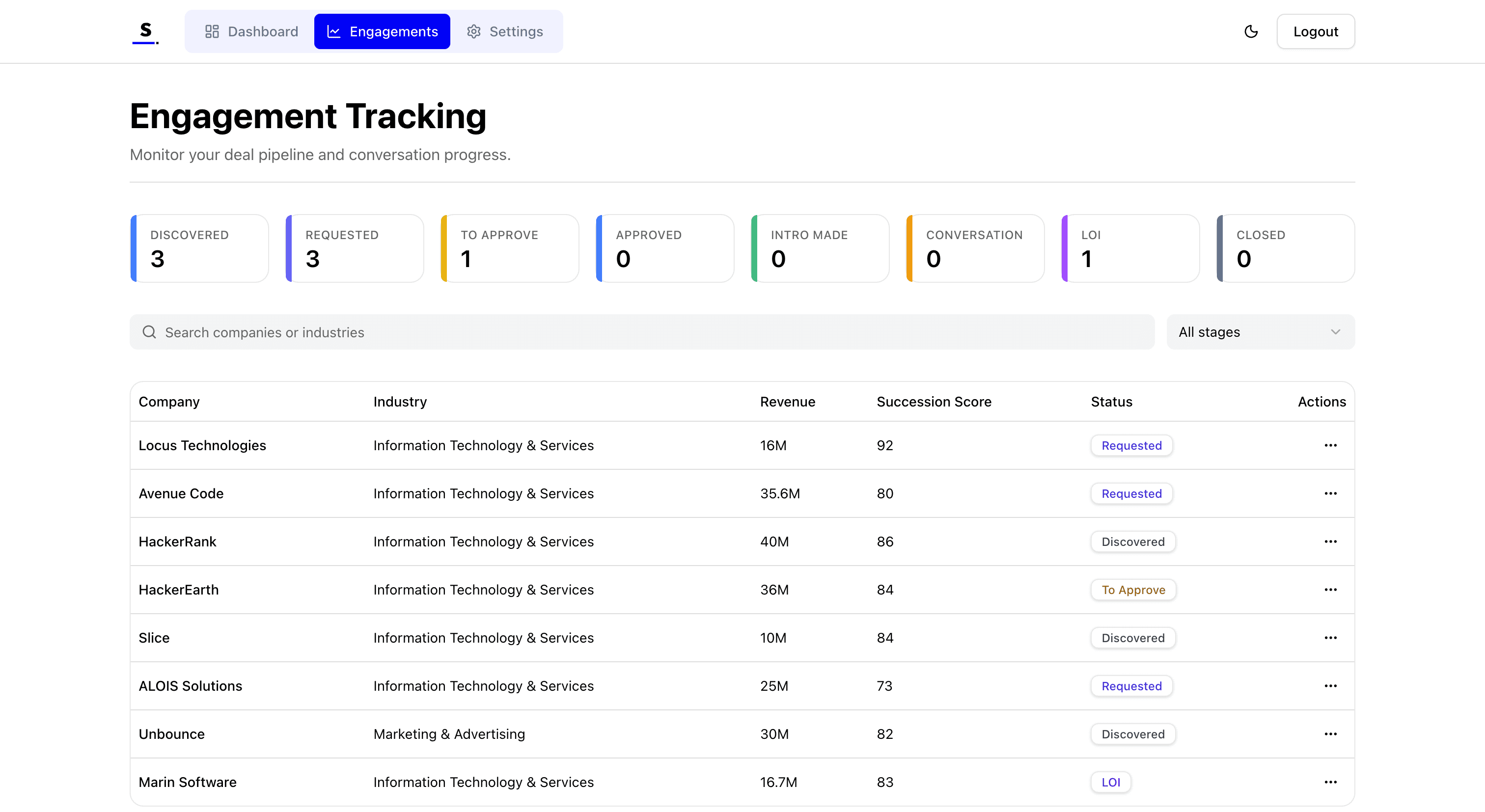 The Buyer Portal: We created an intuitive interface where buyers can manage their deal flow. They can set buying profiles, view their curated list of scored companies, "like" prospects to save them, and formally "Request an Introduction" with a single click.