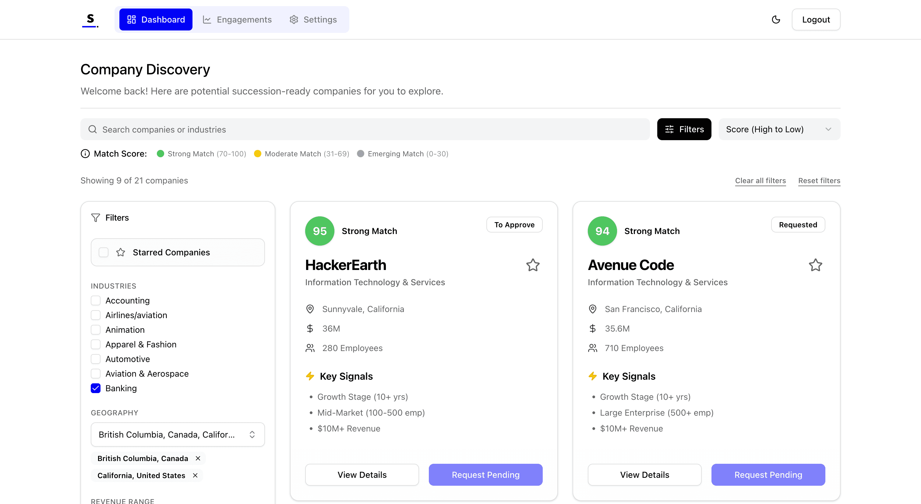 Proprietary Matching Algorithm: We developed a logic-based scoring engine that analyzes a selling company’s attributes (size, region, financial health) against the buyer’s specific profile. This generates a unique "Match Score" for every prospect, allowing buyers to instantly filter out noise and focus on high-probability targets.